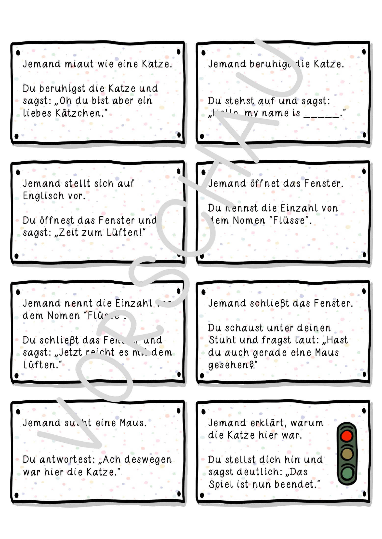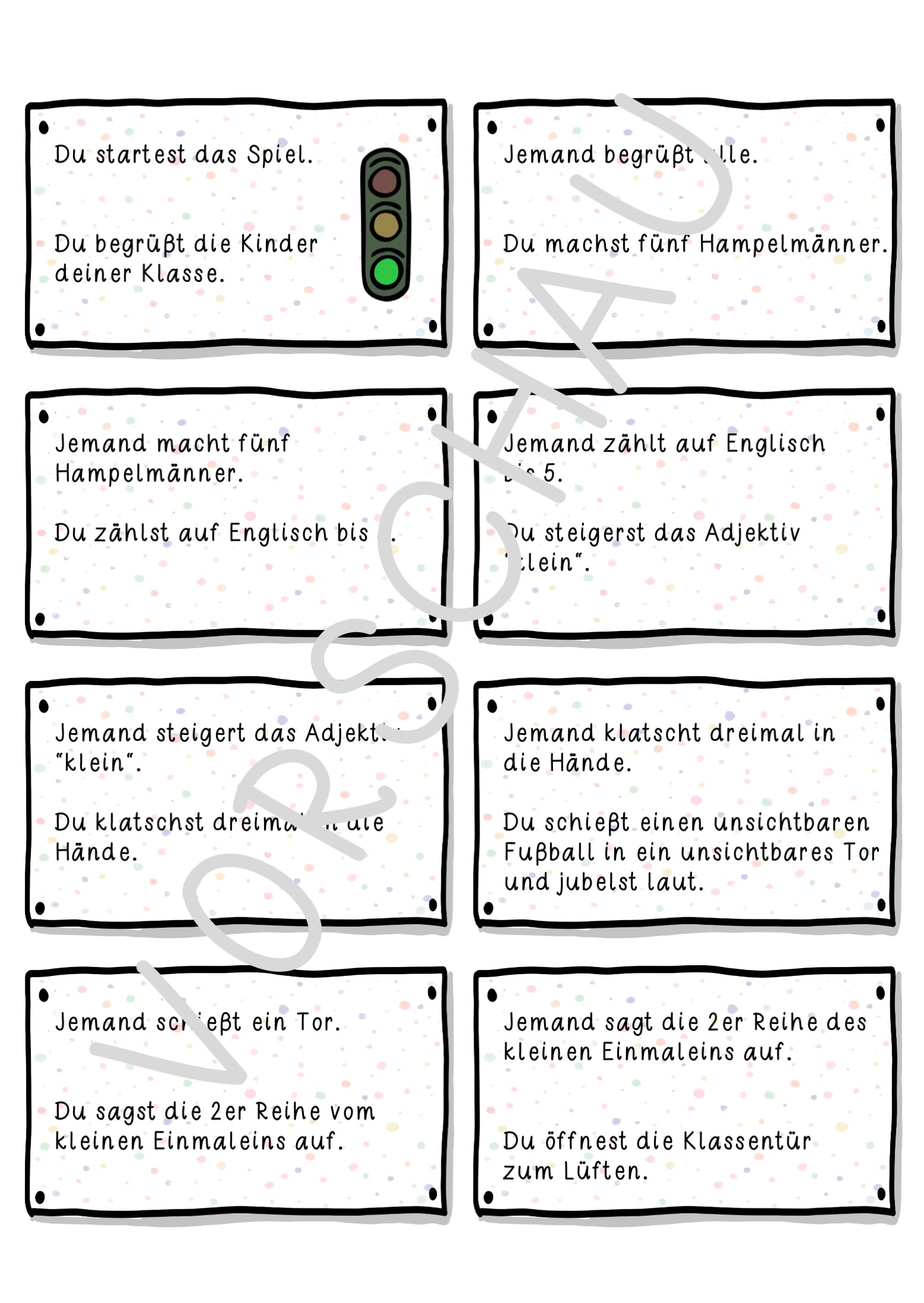 Spielanleitung: Jede/r Schüler/in erhält eine Karte. Das Kind mit der ersten Karte (grüne Ampelkarte – “Du beginnst das Spiel.“) liest diese vor und führt die dort beschriebene Tätigkeit aus. Danach liest das nächste Kind, dessen Text zur ersten Karte passt, seine Karte vor und führt die dort beschriebene Tätigkeit aus. Das erste Kind kann sich dann wieder setzen. Nach und nach liest jedes Kind seine Karte vor bis die Klasse bei der letzten Karte (rote Ampelkarte) angekommen ist.