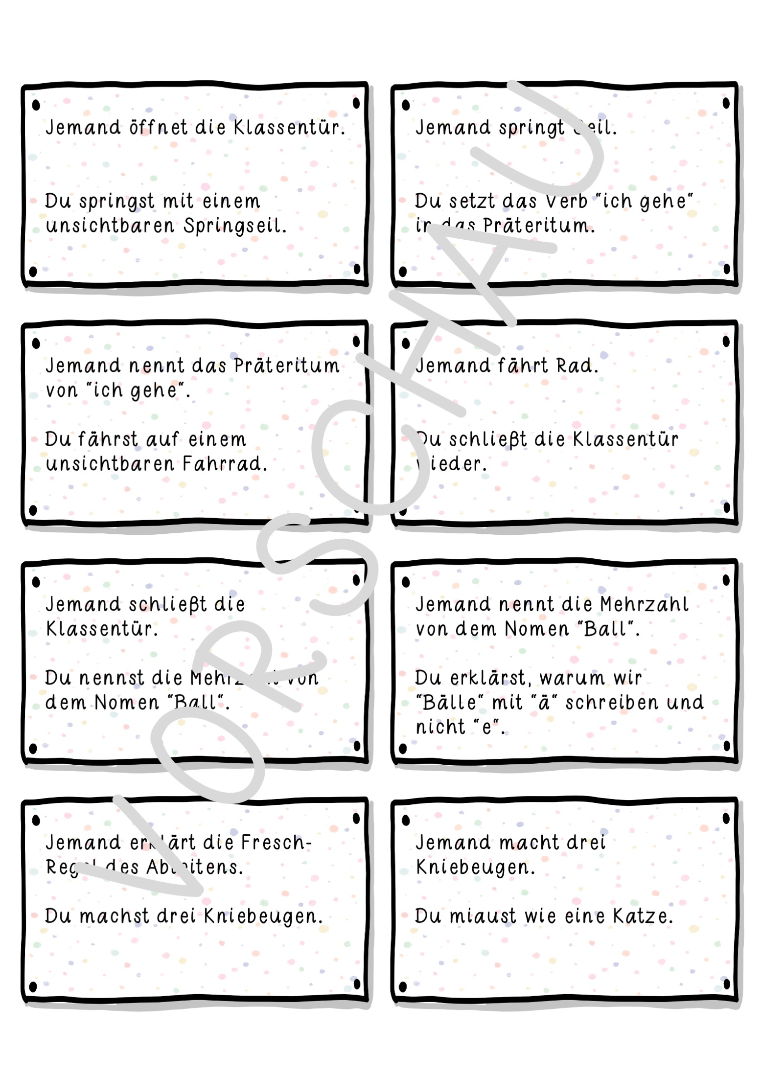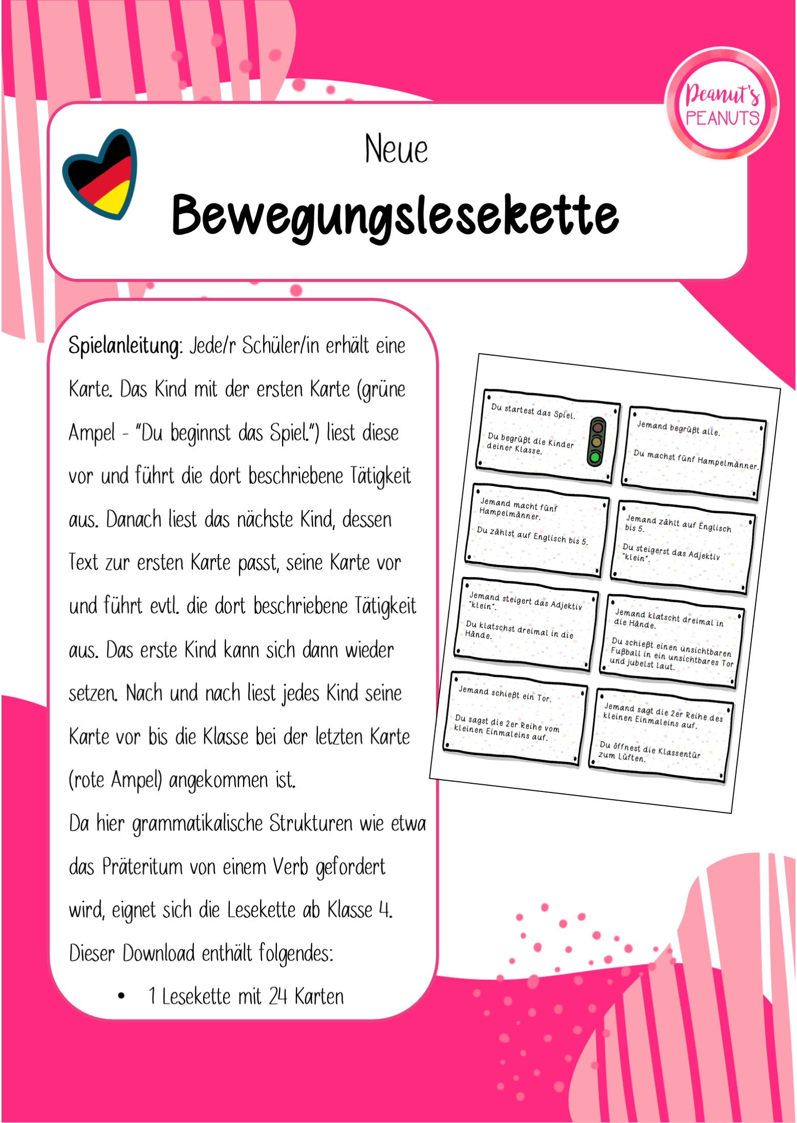 - eine Lesekette bestehend aus 24 Lesekarten im Konfettidesign, um Bewegungen spielerisch in den Unterricht zu integrieren.